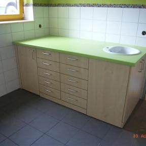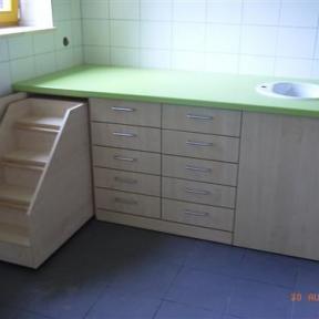 Wickeltisch für einen Kindergarten mit einer ausziehbaren Trappe und einer Waschgelegenheit.