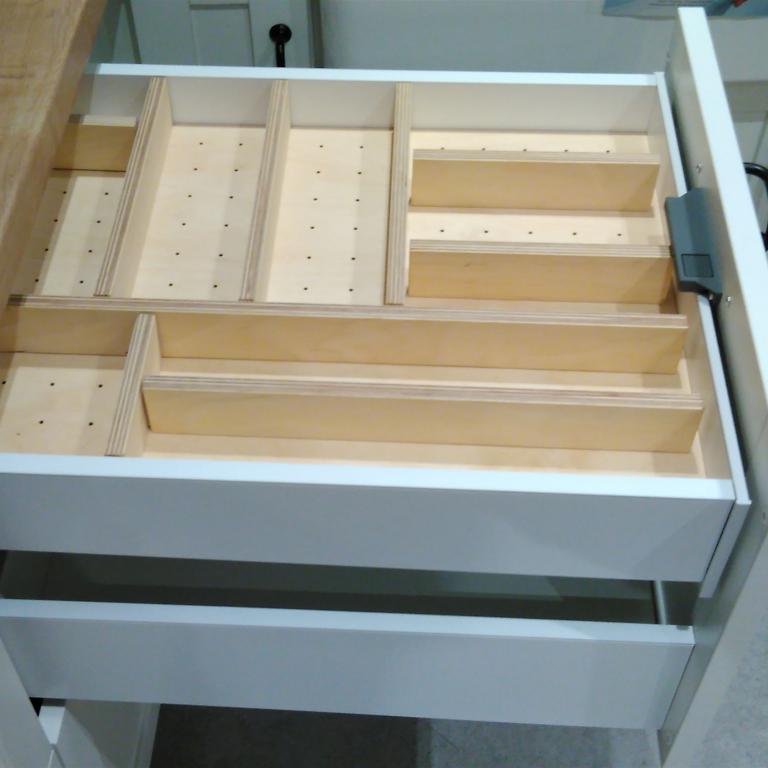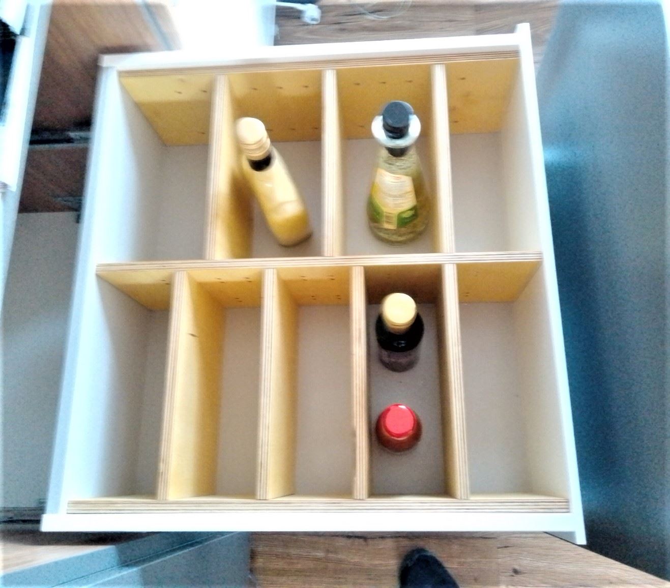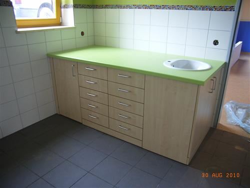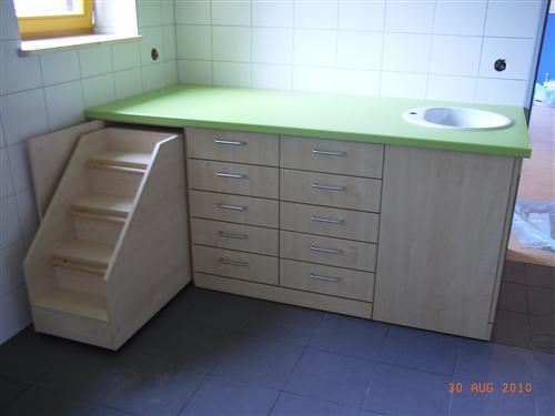 Wickeltisch für einen Kindergarten mit einer ausziehbaren Trappe und einer Waschgelegenheit.