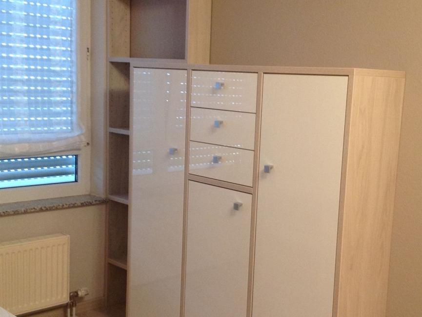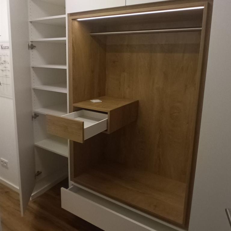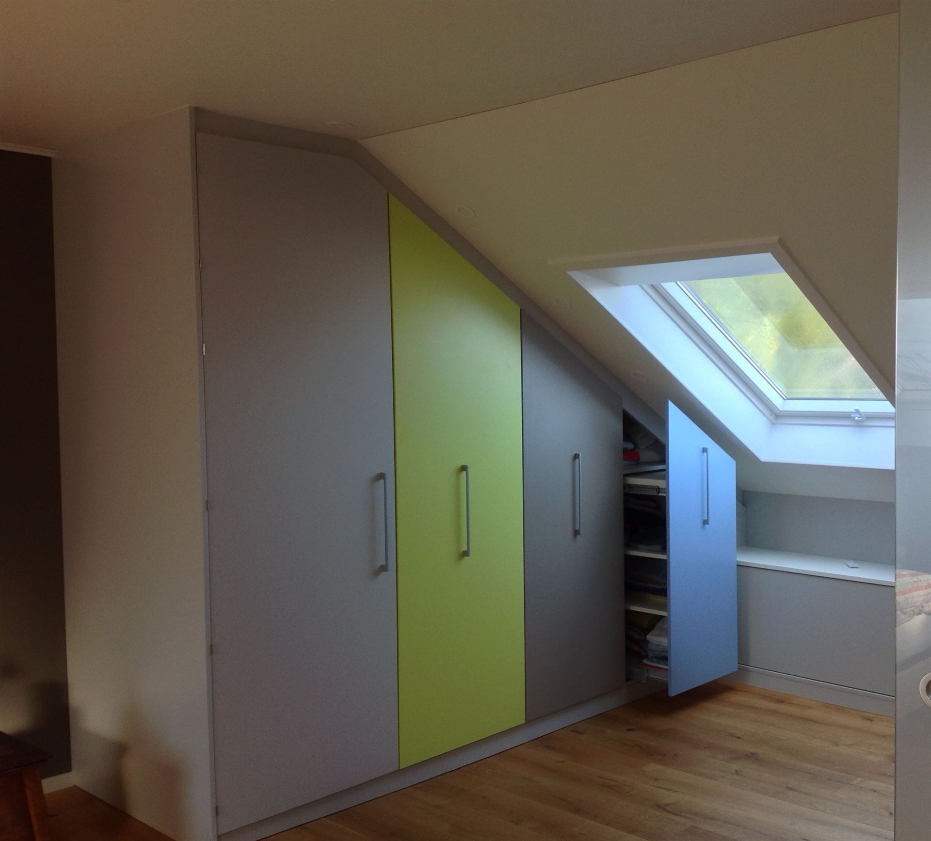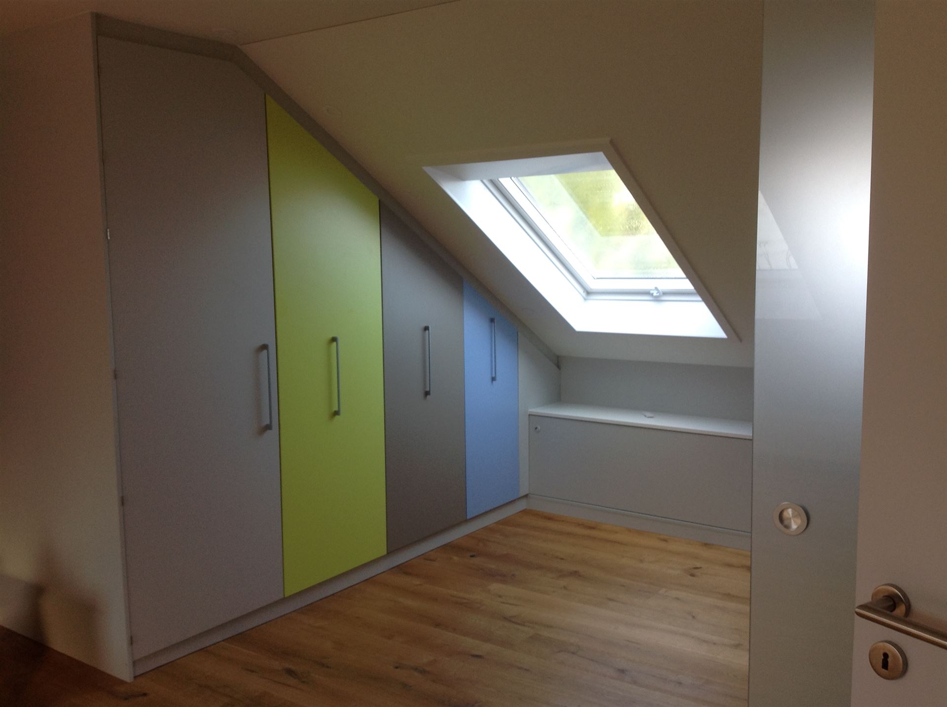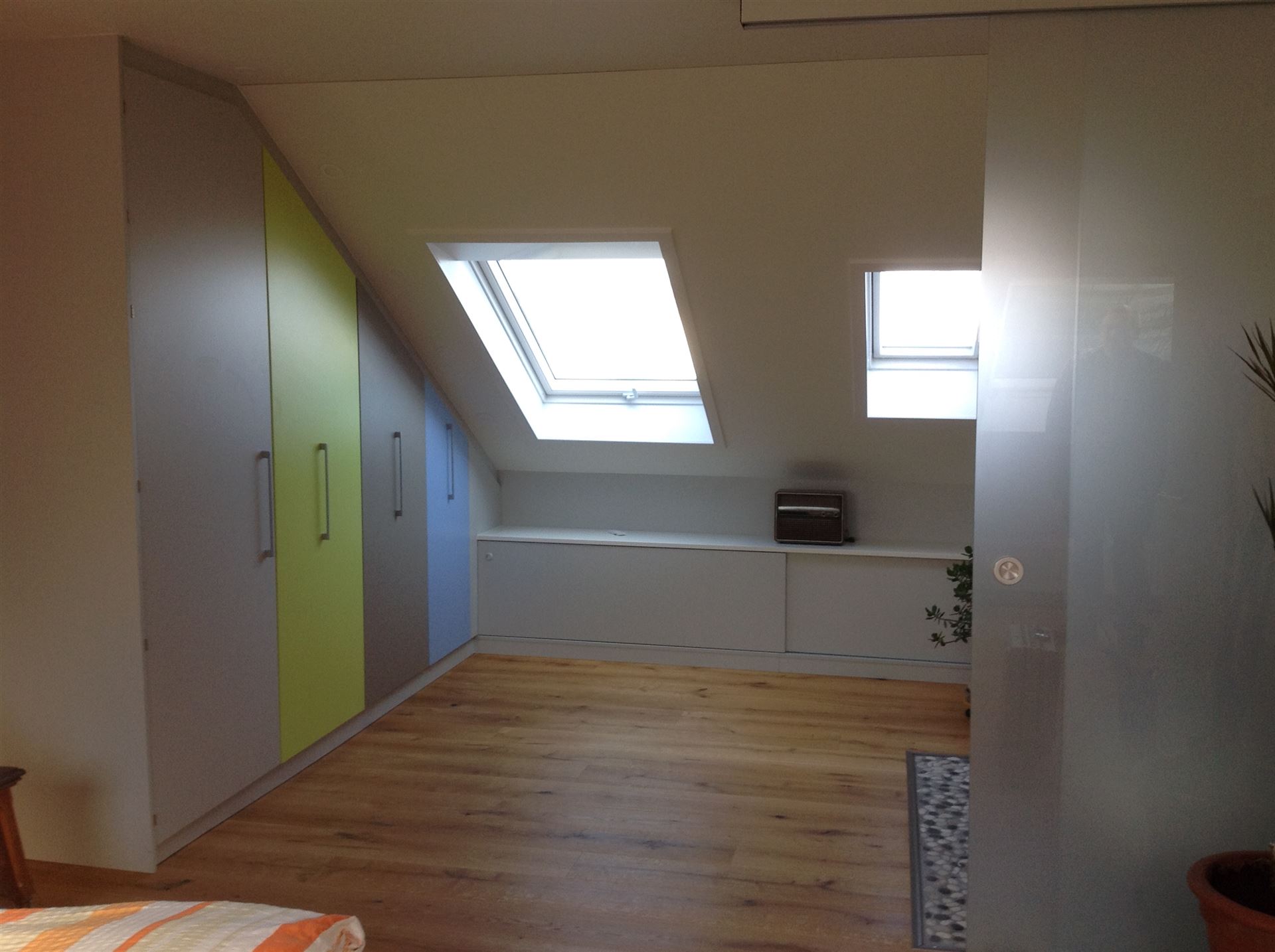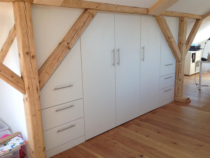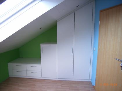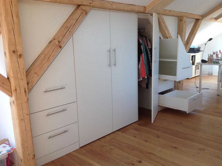 Kleiderschrank mit voller Ausnutzung der Dachschräge und Abstellfläche für Fernsehgerät oder ähnlichem.
