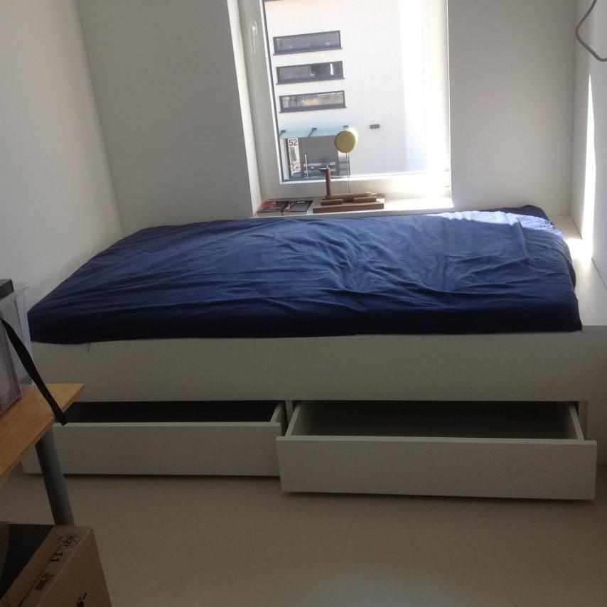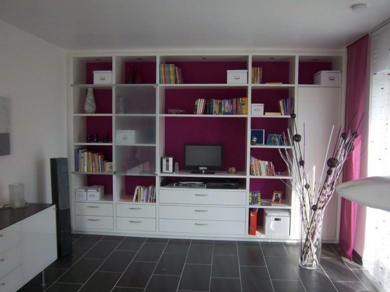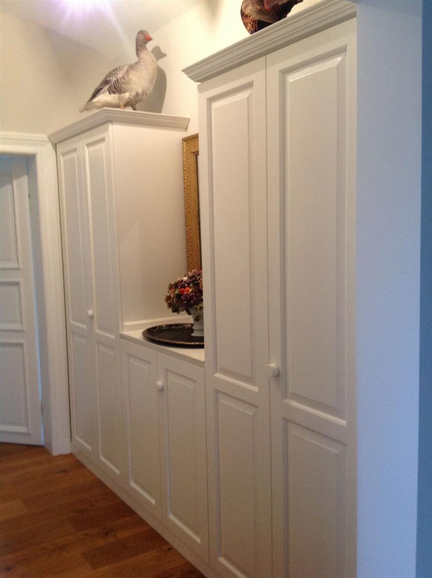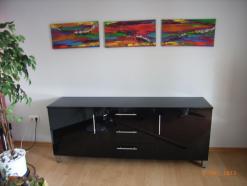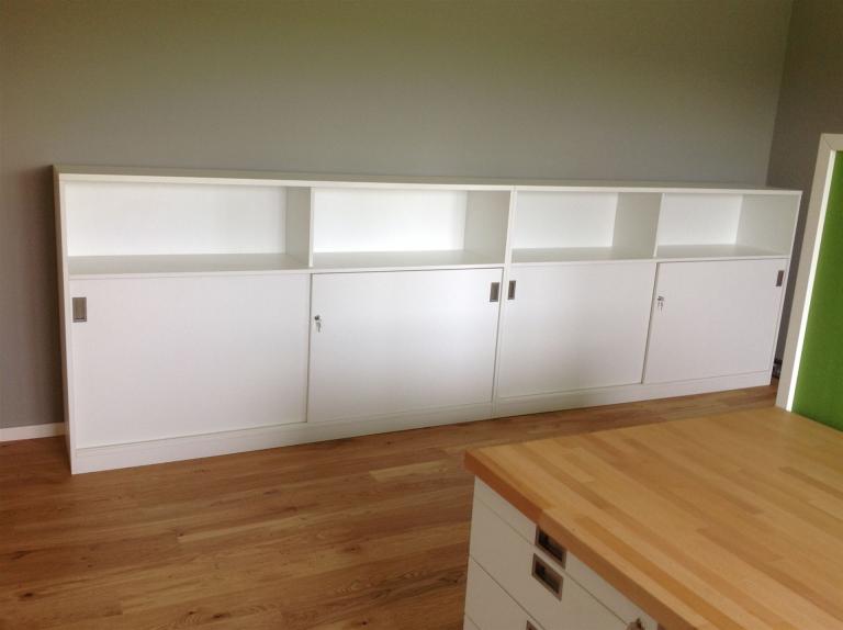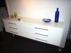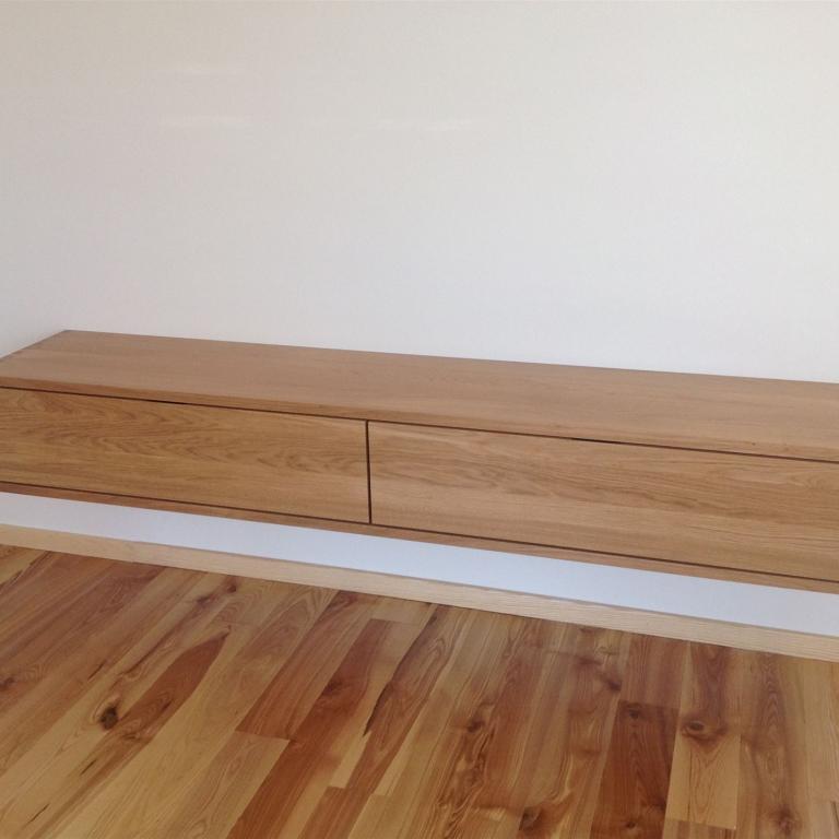 Sideboard frei an der Wand hängend, Oberfläche mit Weißlack überzogen.