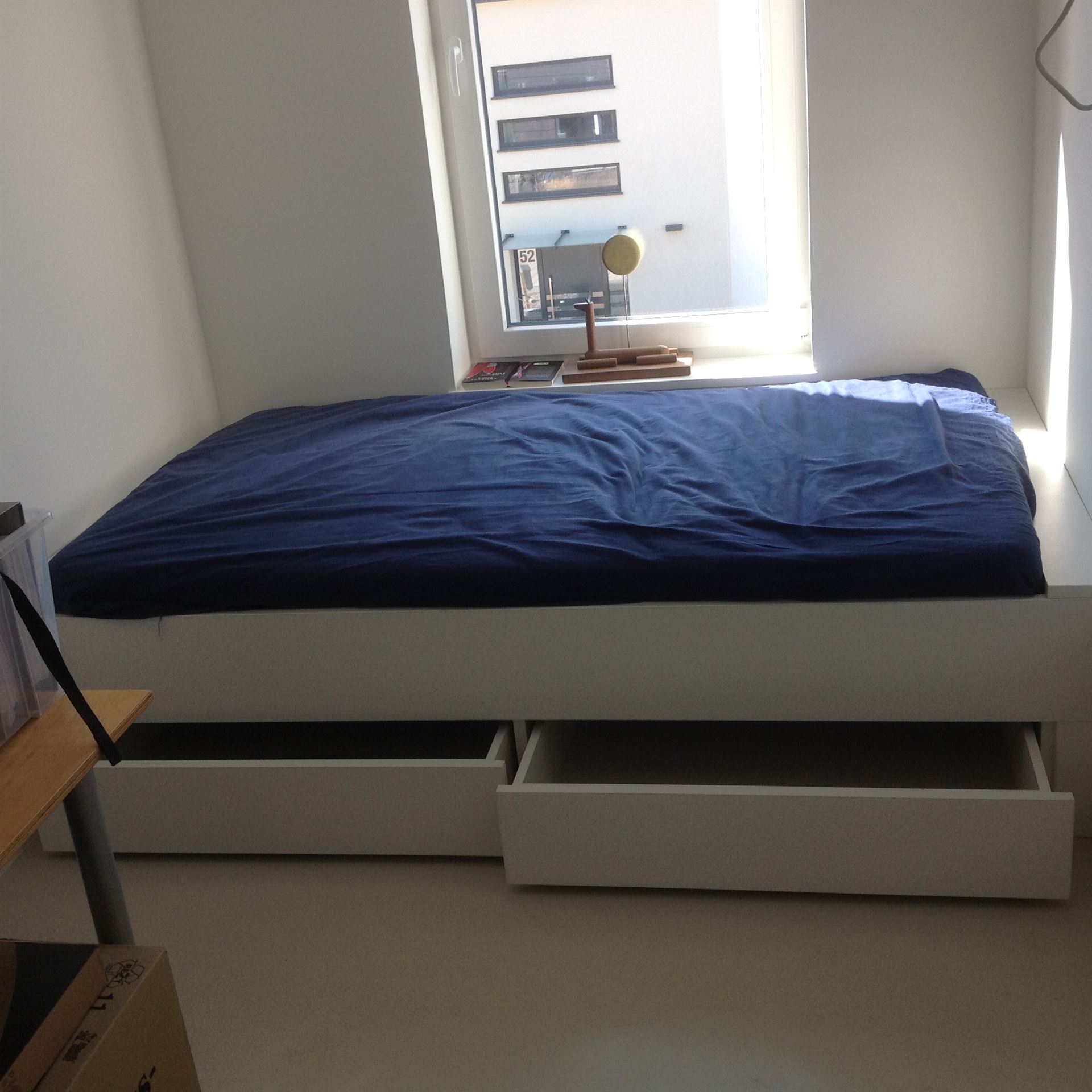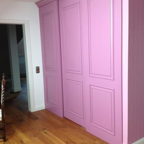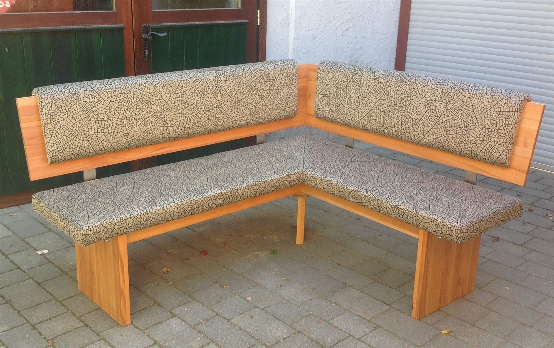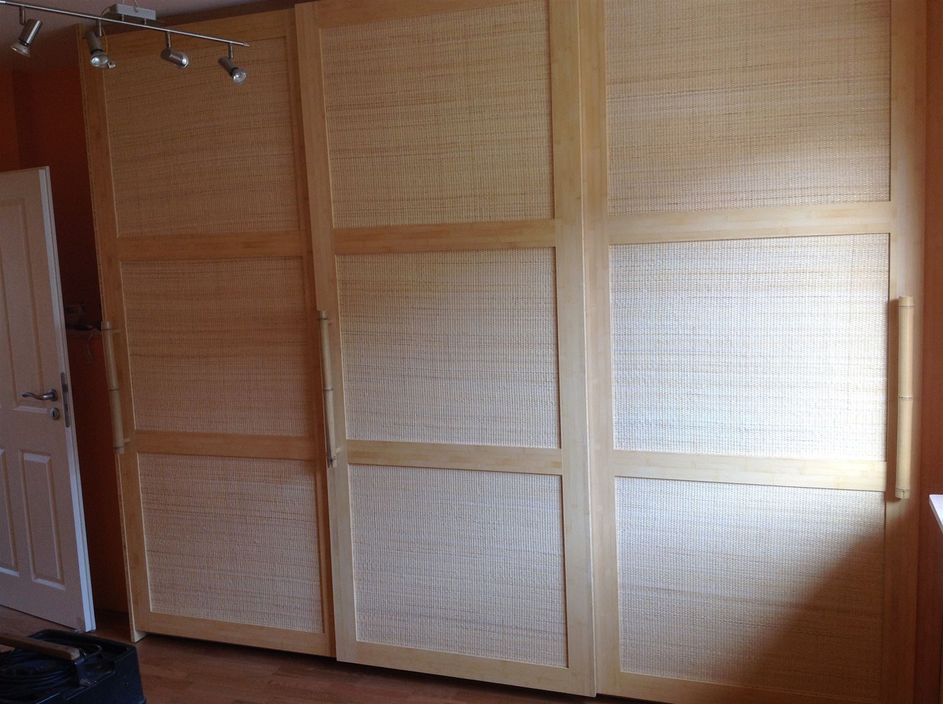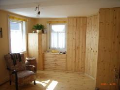 Kleiderschrank aus massiver Kiefer, geölt, genau eingepasst zwischen Wand und Fenster.