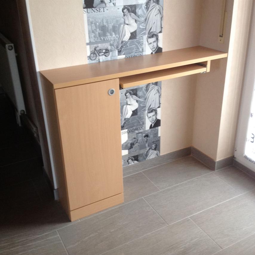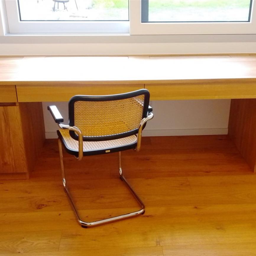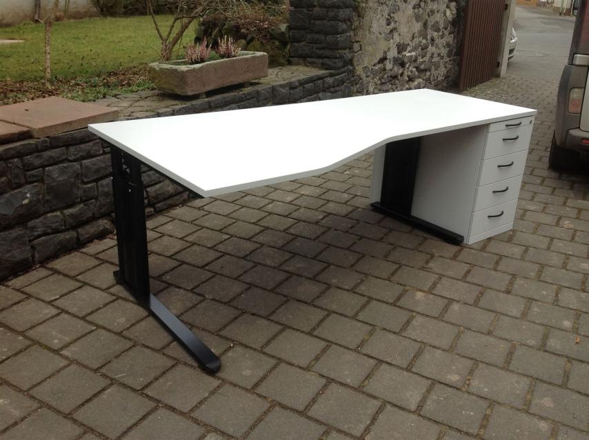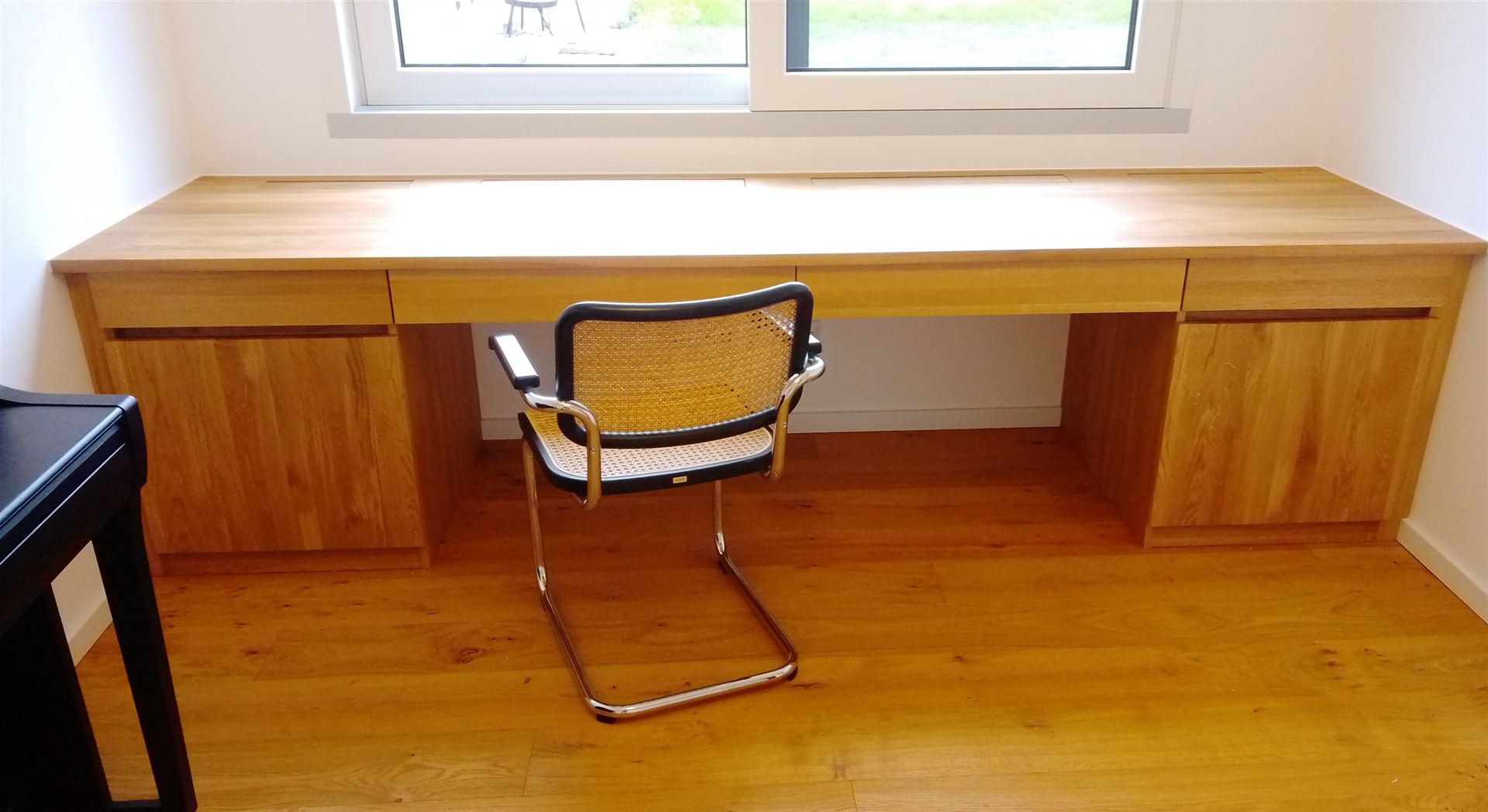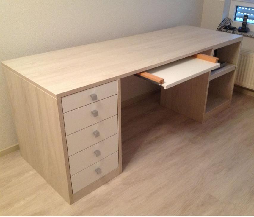 Schreibtisch mit Tatsaturauszug, Druckerauszug rechts und Schubladen