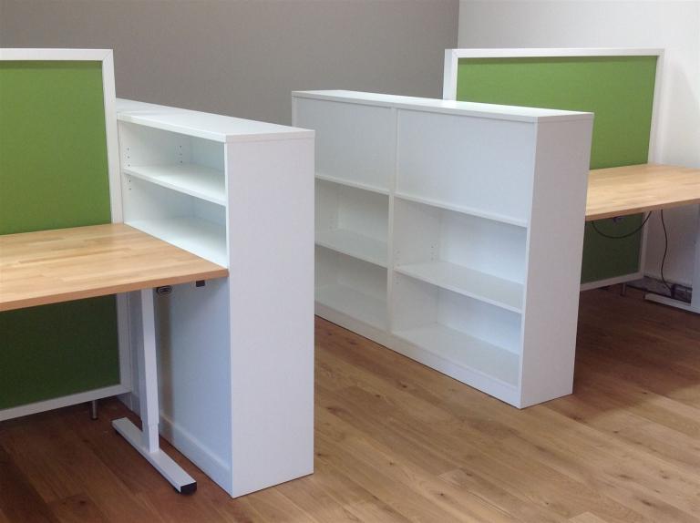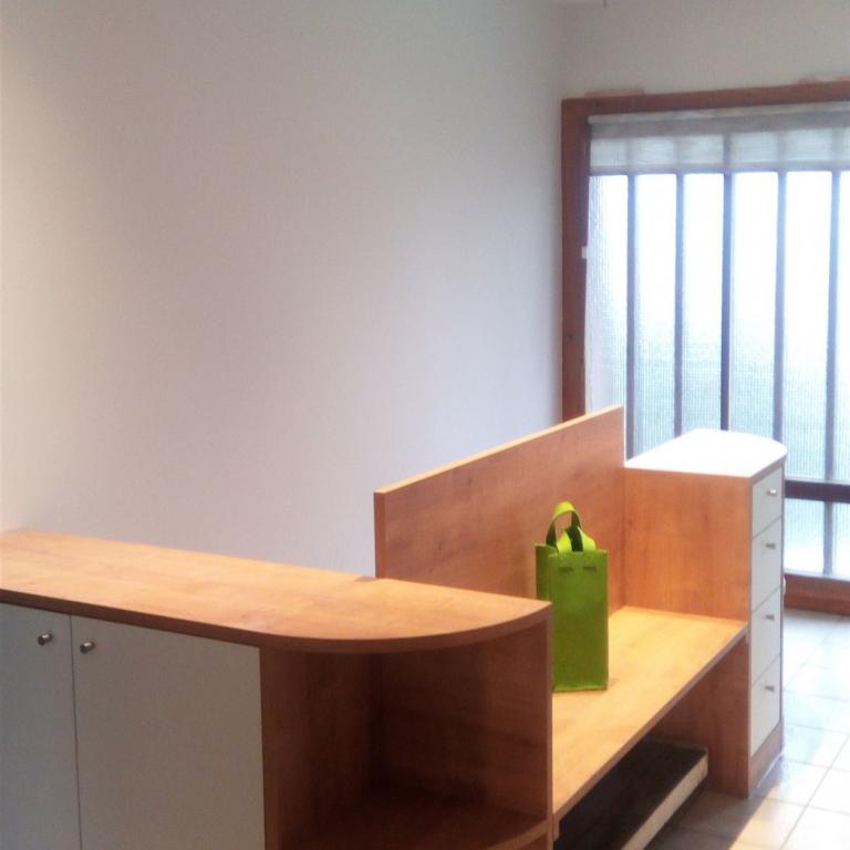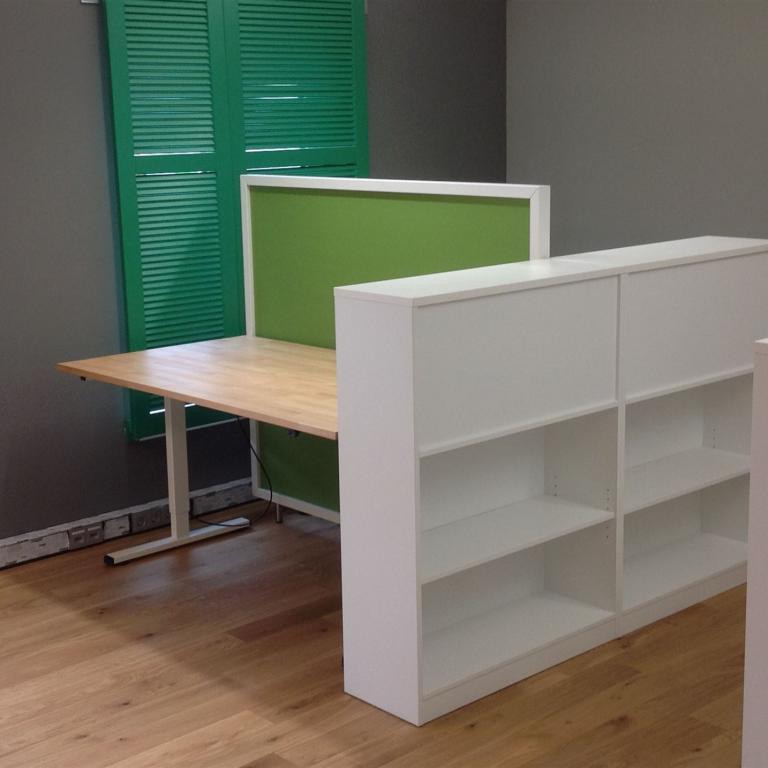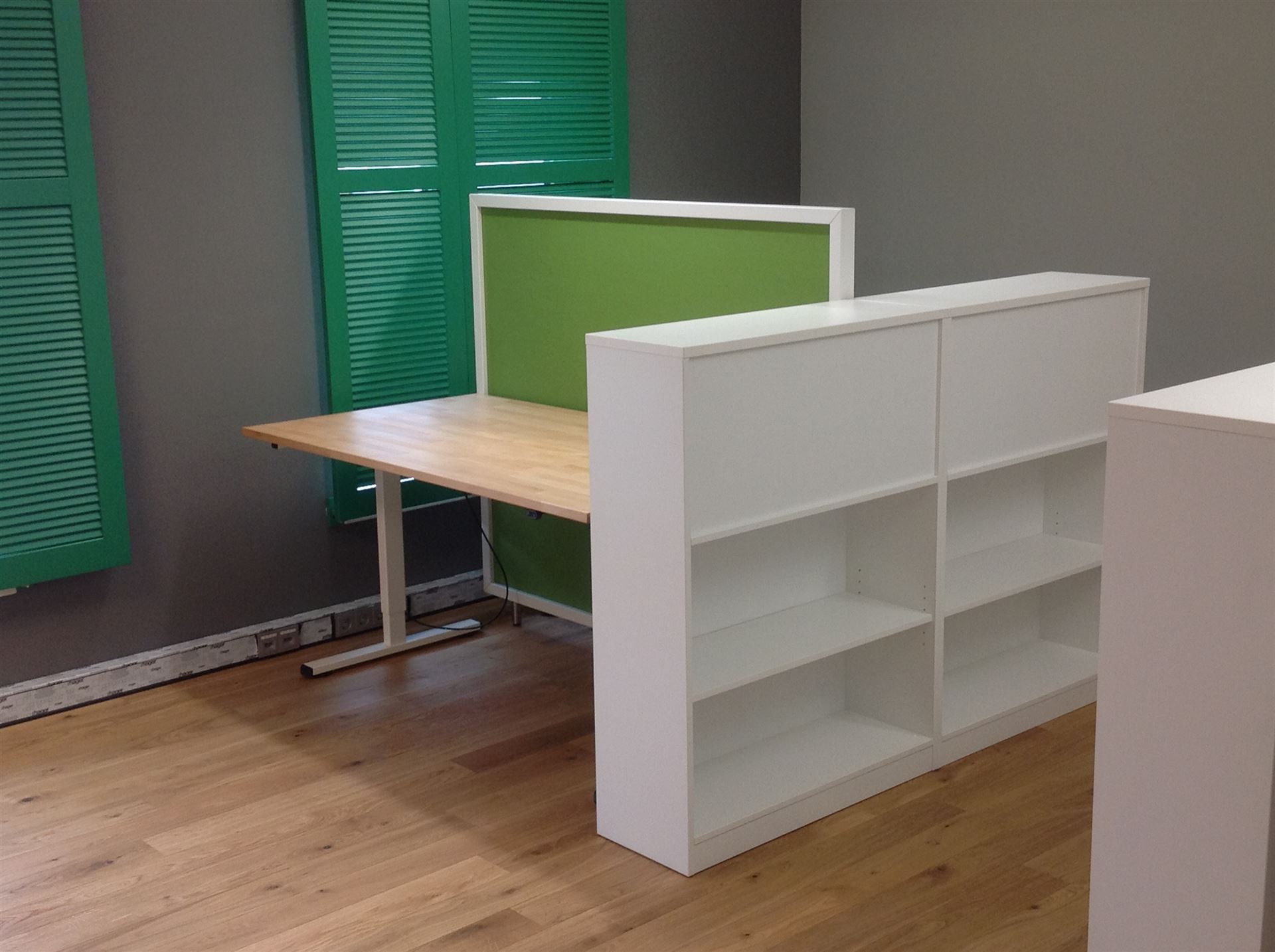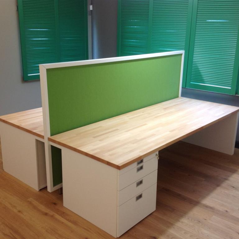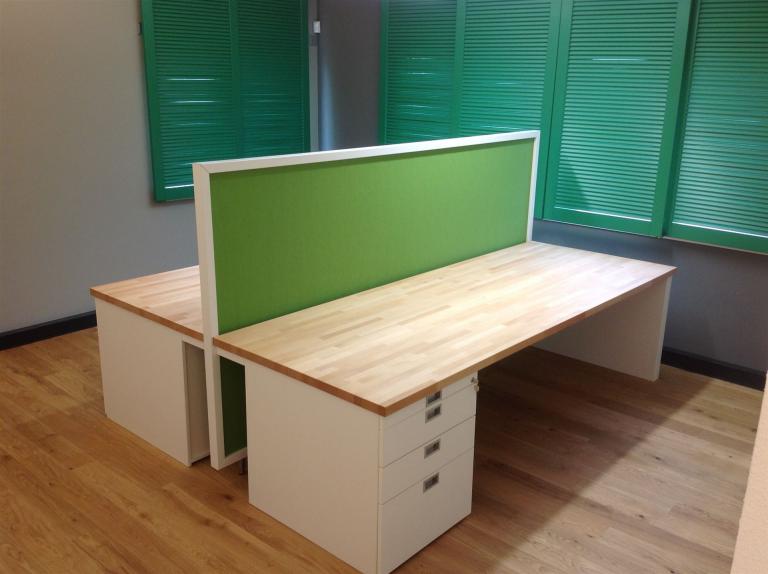 Schreibtisch mit Tatsaturauszug, Druckerauszug rechts und Schubladen